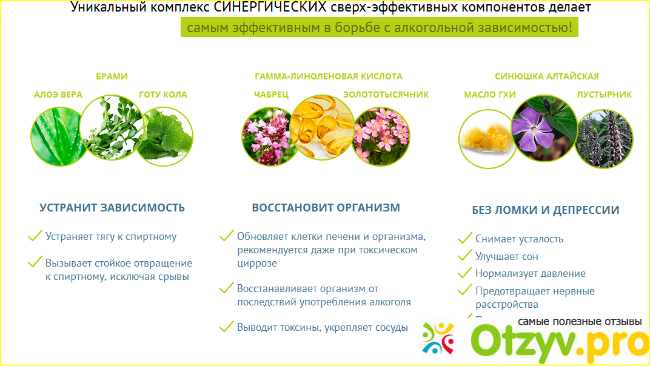 - снимает психологическую зависимость, убирает тягу к алкоголю