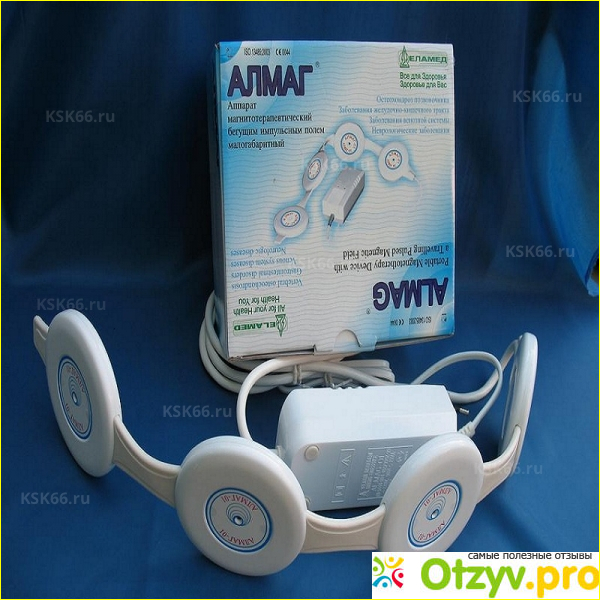 Лечение аппаратом разгоняет кровь, улучшает работу сосудов и капилляров, активизирует обмен веществ. Сам по себе прибор Алмаг довольно компактный, представляет собой эластичный бинт, на который насажены круглые индикаторы электро магнитного поля, которые соприкасаясь с телом человека и оказывают терапевтический эффект. Аппарат работает от сети, при включении индикаторы загораются зеленым. работает бесшумно, что несомненно является большим плюсом.