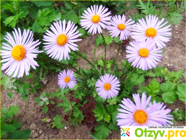От всех астр она отличается тем, что ее листья собраны в прикорневые розетки и из них появляются цветоносы, увенчанные красивыми сиреневыми цветками.