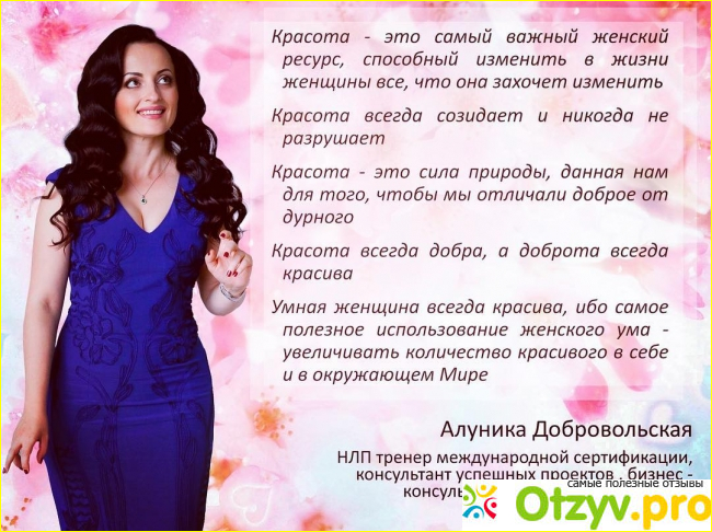 Алуника Добровольская в экспрессивной манере учит своих зрителей и слушателей умению грамотно выстраивать свою жизнь и создавать правильные мысли, чтобы четко программировать события. Конечно же вся работа ведется для женщин. Да-да, нашим женщинам, воспитанным матерями из советского союза от рождения внушено огромное количество стереотипов, комплексов, просто с молоком матери передано какое-то чувство ущербности и собственной неполноценности.