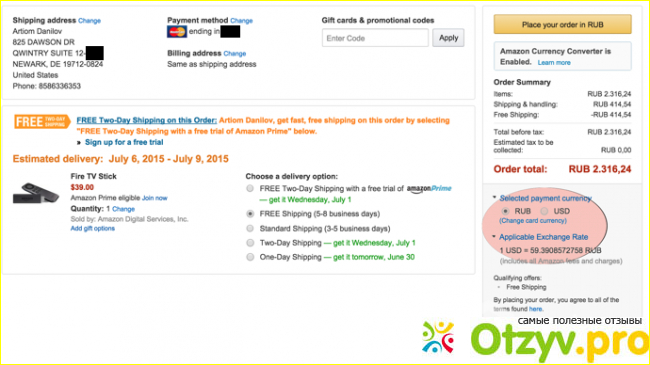 В блоке Selected payment currency советую поменять RUB на USD. Таким образом, рубль будет конвертироваться в доллары по курсу Mastercard или Visa, а не по курсу Amazon, а вы не потеряете на пустом месте десять процентов от суммы покупки.