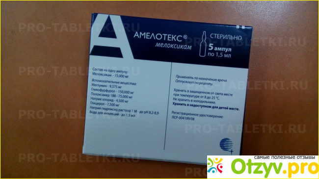 В состав препарата входит мелоксикам, он известен своим противовоспалительным и обезболивающим действием. Амелотекс выпускается в виде ампул, раствора в каждой содержится 1,5 мл, количество в пачке бывает разное - от трех штук до двадцати, что очень удобно для подбора необходимой длительности курса лечения.