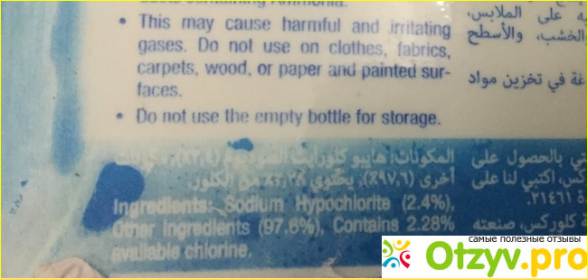 Состав у Хлорокса идентичен, основное дейстующее вещество - гипохлорит. Также присутствует отдушка и краситель. Но в отличие от доместоса, производитель предупреждает, что средство не является безопасным, и не рекомендует отбеливать им одежду. И не зря - ведь гипохлорит натрия токсичен, а его испарения могут вызывать кашель, воспаление слизистых, и даже удушающий эффект. А при контакте с кожей может вызвать серьезные раздражения.