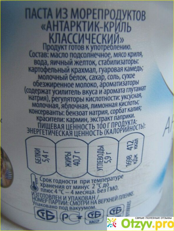 Что же еще есть в составе пасты, кроме мяса криля? Масло подсолнечное, вода, яичный желток, стабилизаторы, молочный белок, сахар, соль, сухое молоко, ароматизаторы (среди которых глутамат натрия), регуляторы кислотности, консерванты и красители.