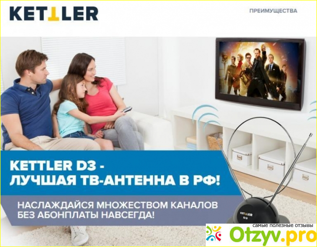 Но, сучилось так, что этот оператор перестал оказывать телевизионные услуги и нам пришлось искать другой выход из ситуации. Как раз в это время мне на глаза попалась реклама в интернете про чудо-антенну Kettler D3, которая стоит всего 99 рублей и за эти деньги производитель обещал огромное количество каналов, в том числе и платных, сигнал принимает антенна более, чем с двадцати спутников. А усилитель сигнала, который встроен в антенну, позволял смотреть каналы в превосходном цифровом качестве.