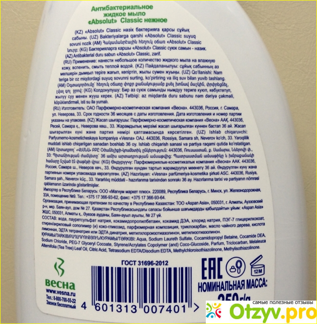 Вторая, с другой стороны рассказывает нам о всей остальной необходимой информации: состав, применение, эффект, основная информация о самом производителе. И все это на очень многих языках. Кстати, это мыло производит концерн «Весна». Это мыло у них невероятно удачное и качественное, что нельзя сказать о мыле-недоразумении «Дегтярное», которое не дегтярное вовсе, а только название одно.