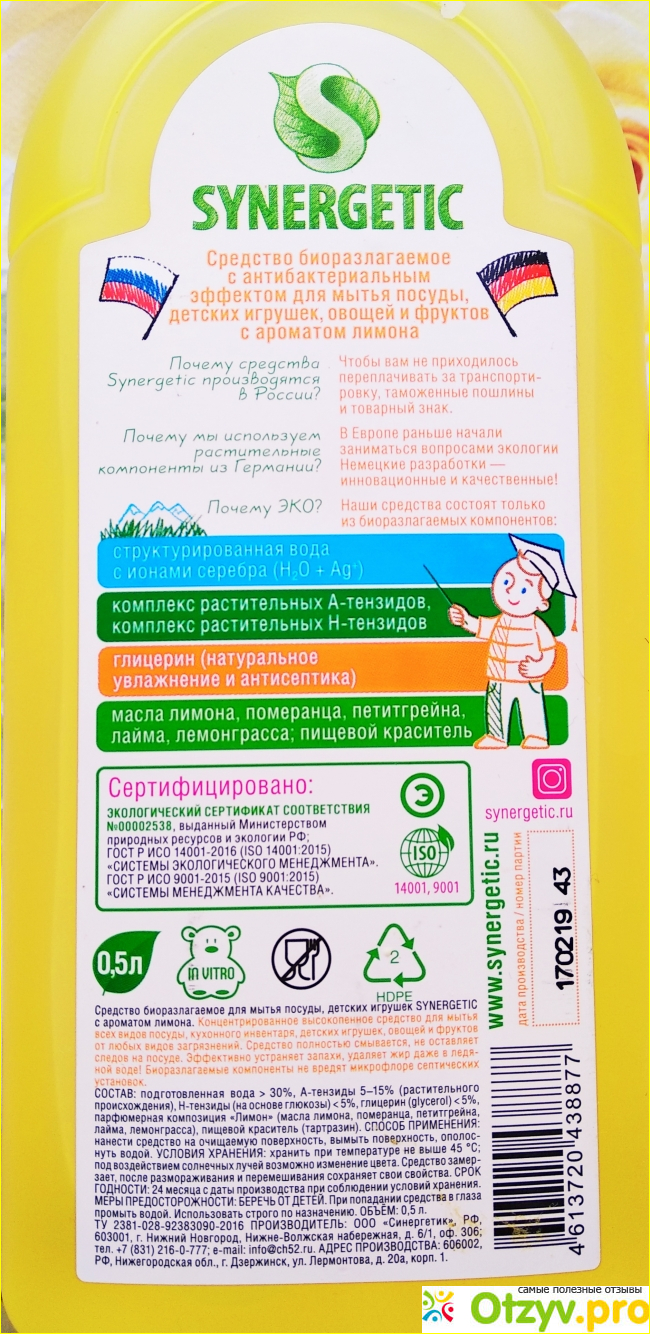 Все споры, которые ходят вокруг этого средства связаны А-тензидами, которые входят в состав Syrengetic. На самом деле тензиды это то же самое, что и обычные ПАВы, без которых ни одно средство не будет пенится. Производитель утверждает, что ПАВы на самом деле опасны, потому что это настоящая химия, а тензиды получаются из растительных компонентов, быстро разлогаются и не являются опасными для здоровья и окружающей среды. Всё же вопрос о безопасности тензидов остаётся спорным, потому что их получают с помощью очень опасной химии. Как именно их получают и какие вещества для этого используют может знать только производитель, потому что нигде нет такой информации. Спорить на счёт безопасности совсем не хочется, ведь в обычных средствах используют ПАВы, поэтому советую любое средство, даже экологически безопасное, хорошо смывать.