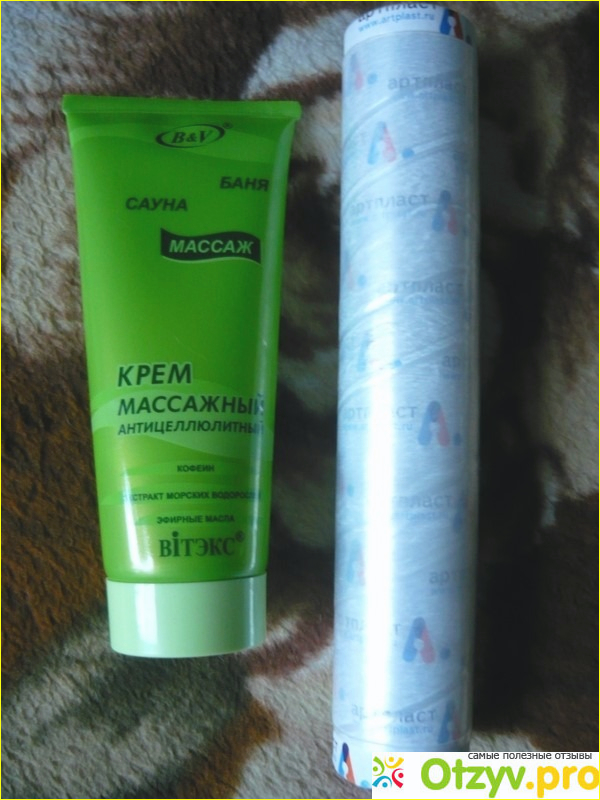 Крем массажный антицеллюлитный, хорошо наносить на кожу во время занятий. Я обычно делала так. Наносила крем на кожу, оборачивала пищевой пленкой и занималась обычной зарядкой, или интенсивно убирала квартиру. Минут через 5-10 кожа начинала печь, такой эффект сохранялся во время всего времени. Во время обертывания кожа становилась мокрая, это выделялась лишняя жидкость.