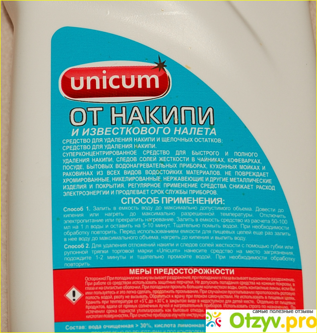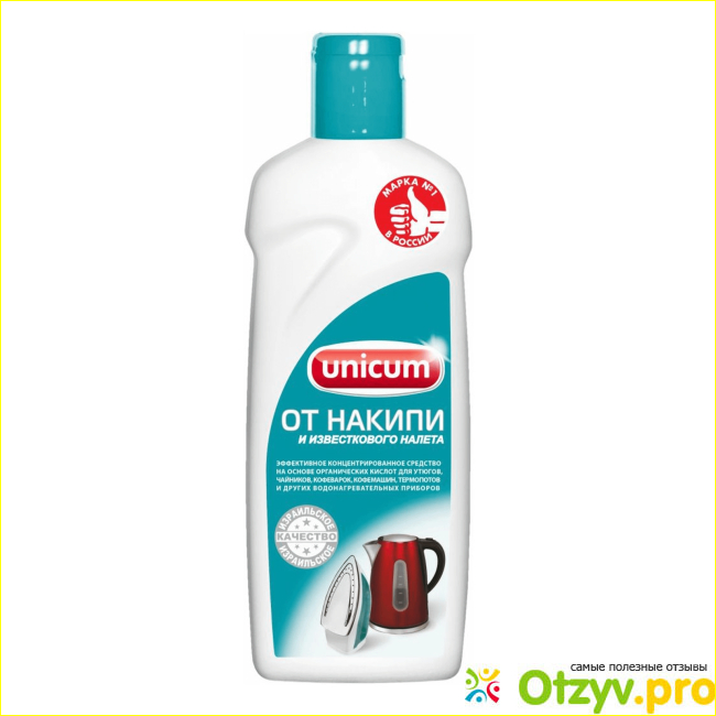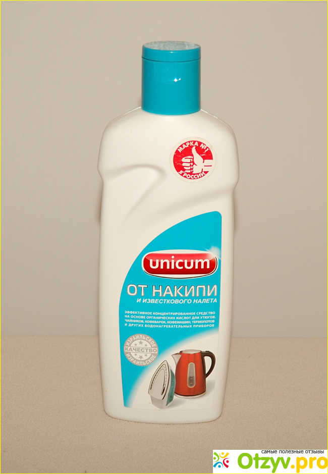 Производится он в России под контролем держателя израильской марки Unicum и предназначен для очистки чайников, кофеварок, утюгов и других бытовых приборов, которые в процессе работы кипятят воду.