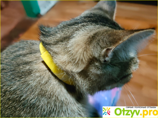 Через месяц коту удалось снять ошейник, который он изрядко погрыз. Настаивать не стали, поскольку пользы от него больше нет, а аромат ещё есть.