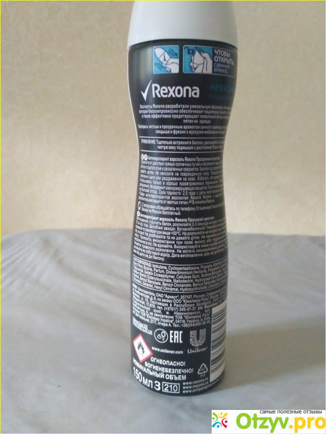 Итак, рассмотрим упаковку. Дизайн антиперспиранта-аэрозоля "прозрачный кристалл" невидимая защита очень стильный и современный. Все оформлено черно-белым цветом с добавление голубого и темно-синего. Форма флакона анатомическая - удобно держать в руке при распылении. Указательный палец без проблем попадает на кнопку распылителя. На лицевой части указано, что дезодорант является лучшей защитой против белых следов на черном и желтых пятен на белом. Длительность защиты составляет 48 часов. Действительно ли это так?