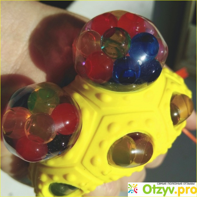 А вот бабушка взялась за эту игрушку из интереса. И та у неё в руках просто посыпалась, из неё при единственном нажатии полезли цветные шарики. Этого не должно же быть. Игрушка создана для того. Чтобы её жать, а эти шарики в плёнке красиво вылизали в дырку. Я этой красоты не понимаю, но всё-таки, так задумано. Значит, этот смайлик был бракованный.