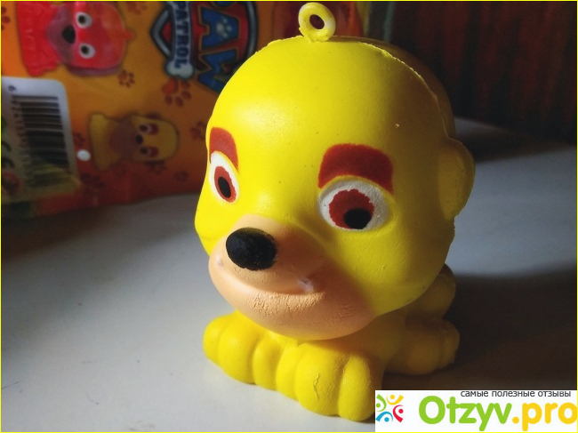 Выбора не было, только бульдог Крепыш. Хотя на упаковке сфотографированы все фигурки. Именно не мультяшные персонажи, а фото сквиши. Щенок помимо цветной упаковки лежит ещё в самоклеящемся пакетике. Да, он действительно очень сильно сжимается и потом восстанавливает форму. Так и должны работать антистрессы этого типа. По структуре игрушка очень напоминает губку.