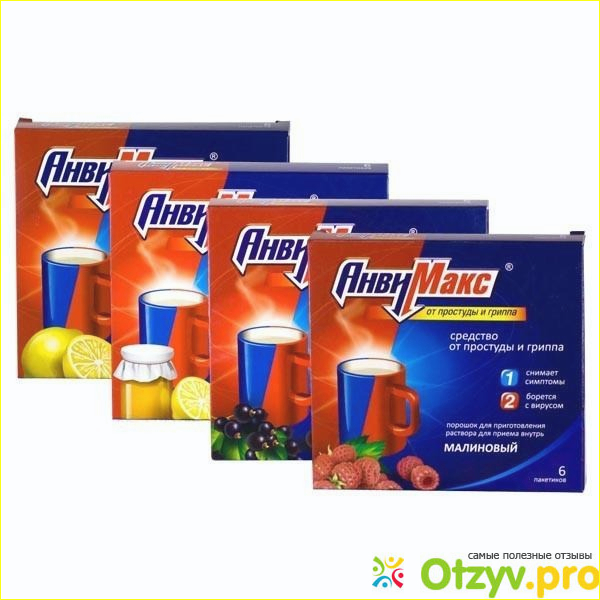 Предназначен он для устранения простуды и гриппа., действующими веществом препарата являются: Парацетамол, Глюконат Кальция, Кислота Аскорбиновая, Римантадин, Лоратидин, Рутозид, плюс дополнительные вещества. Выпускается в виде порошка для приготовления горячего напитка, соответственно он находится в отдельных саше-пакетиках предназначенных для одноразового использования. Есть этот порошок с разными вкусами, который получается благодаря разным пищевым ароматизаторам, это может быть вкус лимона, мёда, чёрной смородины и малины, абсолютно на любой вкус. Кроме выпуска препарата в виде порошка, ещё его выпускают и в виде капсул. Имеет препарат жаропонижающий, анальгетический, ангиопротекторный, антигистаминный, интерфероногенный и противовирусный эффект. Анвимакс нужно принимать вместе с другими препаратами в комплексе.