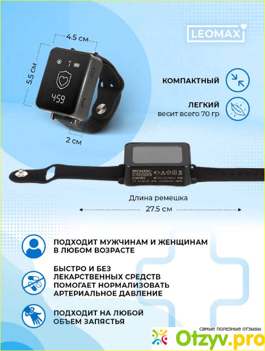 Итак, начну с того, что я не рекламирую данный товар, не покупала его, и вам не советую, так как статья носит ознакомительный характер, не призывает заниматься самолечением любого рода такого вида приборами и средствами. Обратитесь к своему лечащему врачу, артериальная гипертензия НЕ излечивается приборами, а только коррекцией образа жизни и приемом медикаментов. Производители на сайте утверждают, что аппарат для коррекции давления"КАРДИОкомпакт" – это новое веяние в мире медицины, электротерапевтическое устройство, который якобы разработан нашими российскими учеными. Для каких именно целей “разрабатывали”: для воздействия на особенные биоактивные точки в организме у человека, особенно в области запястья, чтобы воздействовать туда с помощью электрических импульсов. И, якобы получается, что благодаря такому точечному воздействию электроимпульсов и удается нормализовать артериальное давление, снизить напряжение в сосудистой стенке, улучшить общее самочувствие и тому подобное.