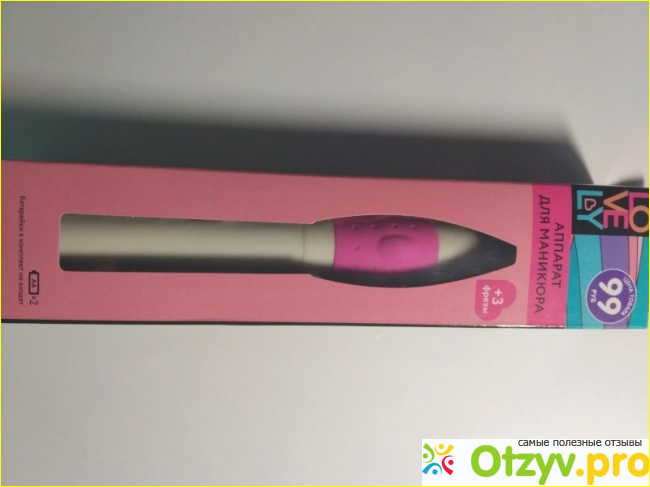 Продается данный маникюрный аппарат в небольшой коробочке приятного разового цвета. Прямо на самой коробочке от него вы можете прочитать его цену. Стоит такой маникюрный аппарат 99 рублей. Цена на данный момент совсем смешная. Так же на самой коробочке от него написана вся подробная информация. Как раз на ней я и прочитала, что для его работы нужно отдельно приобрести две батарейки.