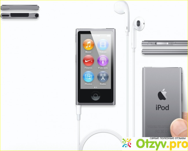 Из функций надо выделить следующие: возможность смотреть видео, причем разрешение экрана на довольно неплохом уровне, сам же экран размером 2,5 дюйма и для музыкального плеера это шикарный показатель. Также на айподе можно просматривать графические материалы. Поддерживает плеер все основные форматы аудио и видео. Слота для карты памяти тут не предусмотрено, внутренней насчитывается 16 ГБ и для музыки этого вполне хватает, но для видео далеко не всегда. Отсутствует диктофон у плеера, зато имеется FM - транслятор, часы, таймер сна и прочие мелкие функции.