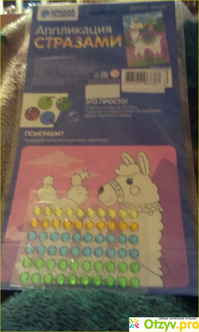 На картинке цветом обозначено куда необходимо клеить стразы, отклеивать стразы очень просто ребёнок справляется без помощи. По времени работа с аппликацией занимает всего лишь минут 20. Ещё минут 10 занимает раскрашивание картинки на обратной стороне.