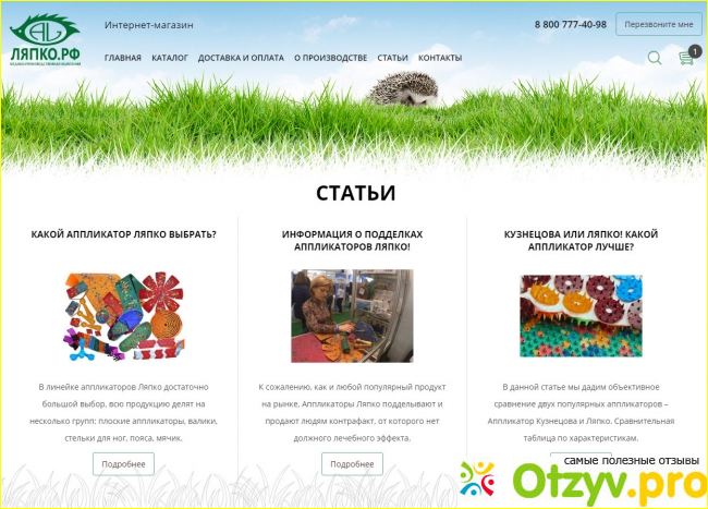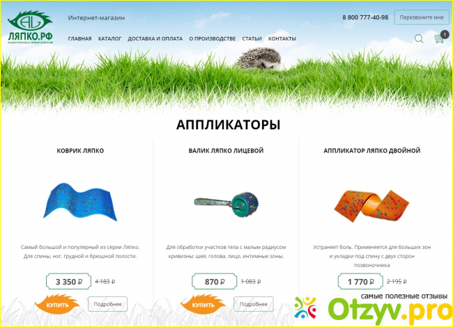 Сайт медико-производственной компании расположен по адресу Ляпко. рф. Является не только онлайн-представительством, но и интернет-магазином, где продаются аппликаторы, стельки, массажеры, пояса, валики, коврики и прочие медицинские устройства, используемые в рефлексотерапии.