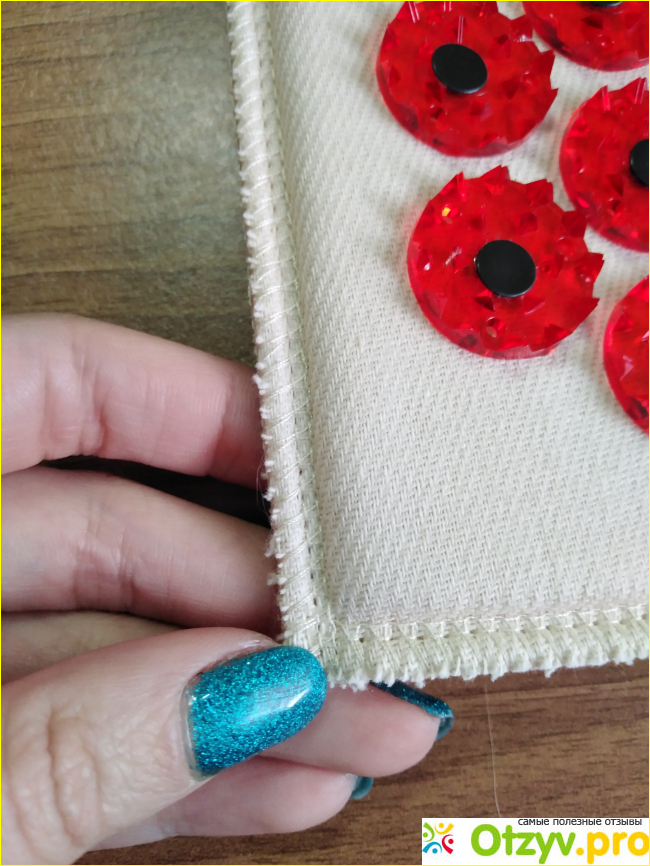 Изготовлен качественно, за столько времени использования все цело. Шипы острыми кажутся только на первый взгляд, потом к ним привыкаешь. Чувство после использования, как после сеанса легкого массажа.
