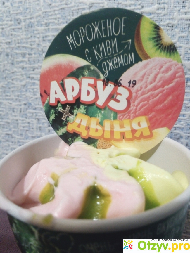 Удалив эту крышку, я получаю эстетическое наслаждение только от внешнего вида мороженого, где гармонично сочетаются цвета розового арбуза и жёлтой дыни,