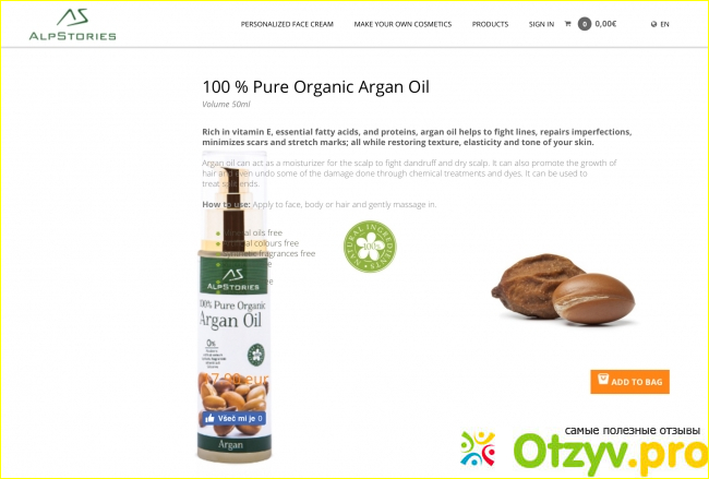 Чем же примечательно именно данное конкретное масло арганы? Если ответить кратко, то я бы сказала, что соотношением цены и качества продукта. Судите сами, за 17,9 евро мы получаем отличного качества масло, без удешевляющих добавок, без каких-либо разбавлений, чистое. И хотя сама торговая марка Alpstories из Словении, но страна происхождения продукта — именно Марокко, как и должно быть. Купить героя отзыва можно на официальном сайте Alpstories.com.