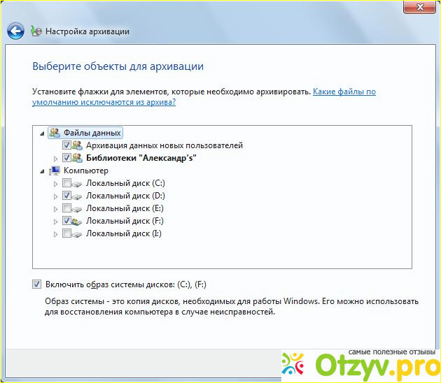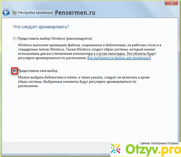 Далее программа архиватора Вам предложит два варианта объектов архивирования. Это либо Windows сам выбирает что архивировать, или Вы сами выбираете что архивировать. Я Вам рекомендую поставить точку на том, что Вы самостоятельно будите выбирать, что архивировать.