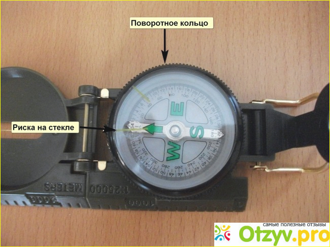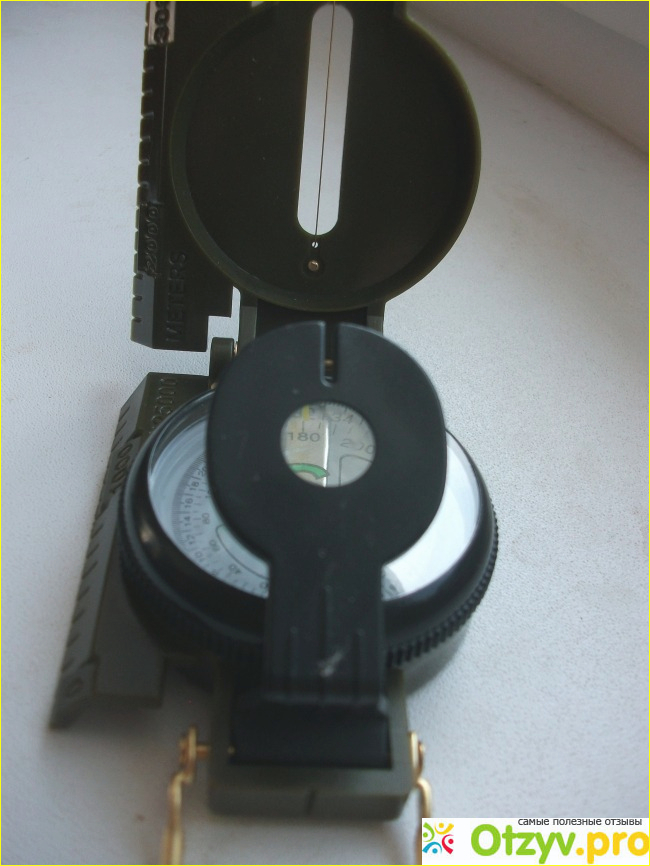 Отличие армейского компаса заключается, во-первых, в том, что здесь вращается не только стрелка, а вся шкала. При этом спичка не нужна, её роль выполняет система прицелов: нить, натянутая в верхней крышке и прорезь в держателе линзы.