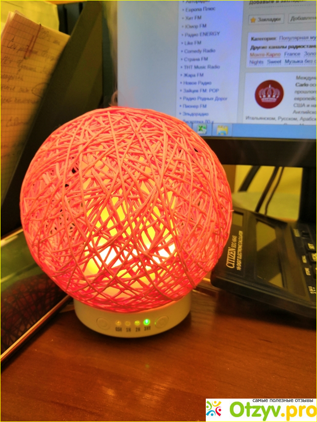 Маленькая, прекрасно поместилась на рабочем столе. Спереди несколько кнопок управления- включение и подсветка. Подсветку можно убрать. Мне как раз из за этого так нравится лампа, поэтому никогда ее не выключаю.