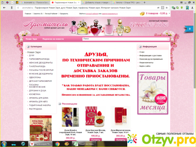 Вообще больше всего можно встретить именно положительных отзывов на данный сайт. Я и не догадывалась, что у нас завод и марка "Заря" до сих пор выпускают ароматы, но благодаря отзывам узнала. Вообще хвалят этот сайт за то, что он конкретизированный, то есть очень доступный для понимания интерфейс. Так же удобно и то, что каждый продукт идет с детализированным описанием и тем самым в значительной степени упрощает выбор той же туалетной воды, ведь далеко не каждый из нас может правильно подобрать под себя тот или иной аромат. А на этом сайте как раз имеется такая замечательная возможность, потому что каждый аромат расписан четко по нотам: сердечная, начальная, нота шлейфа. Хвалят данный интернет магазин еще и за то, что здесь можно подобрать для себя полный спектр косметики по ухода за кожным покровом, так же каждое средство здесь детально расписано.