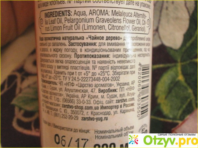 Внешний вид приятный, скажем так, женственный). На флаконе указано, какие масла содержит продукт, в моей покупке, это масло чайного дерева, лимона, герани. Объём водички 200 мл. Это прилично.