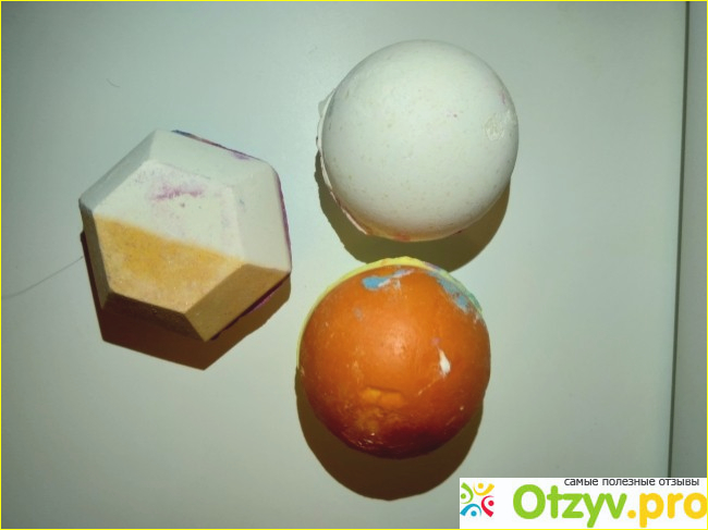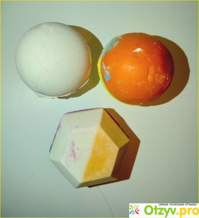 Бомбочки увесистые, но напоминают пенопластовые фигуры. Удивило, то что они мягкие. Бомбы не крошатся, сухие бомбы не красятся (боялась испачкать фон, когда фотографировала). Пахнут приятно. А теперь о применении.