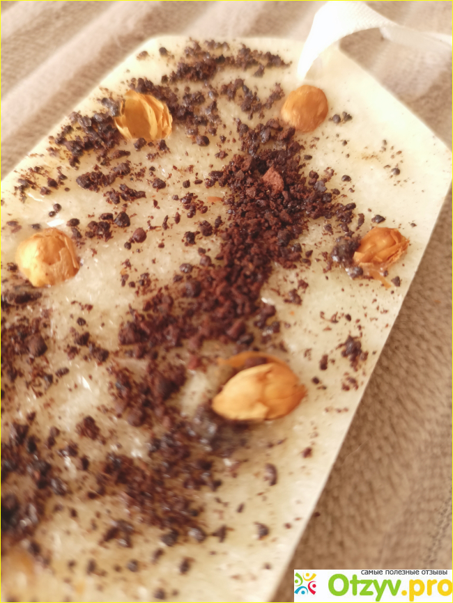 Аромат можно даже сразу учуять, не смотря на то, что саше запаяно дополнительно в слюду. Визуально это похоже на плитку белого шоколада с добавками, хотя белая основа имеет восковой блеск.