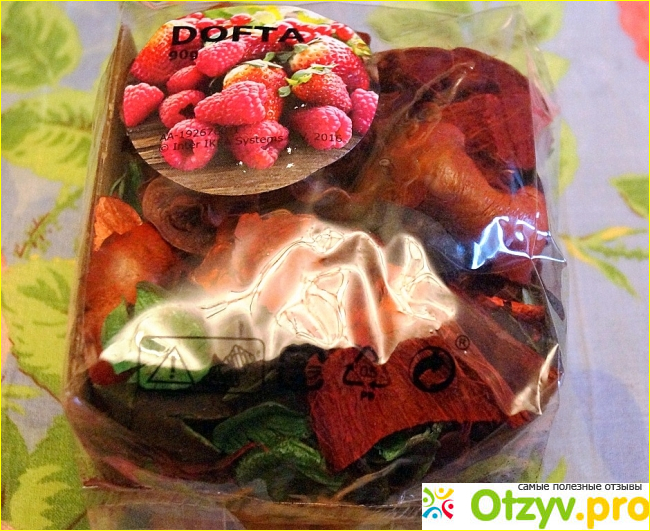 Взглянув на упаковку, сразу и не подумаешь, что это части настоящих цветов, первое впечатление такое, что они выполнены из пластмассы. Даже через не открытую упаковку сразу чувствуется приятный запах содержимого и его без ошибок можно определить. Наша упаковка пахла точно ежевикой. Этот запах не приторный и не навязчивый, а очень даже приятный. Окрашены растения в разные цвета. Тут есть и фиолетовый цвет, и розовый, в основном они все темных оттенков.
