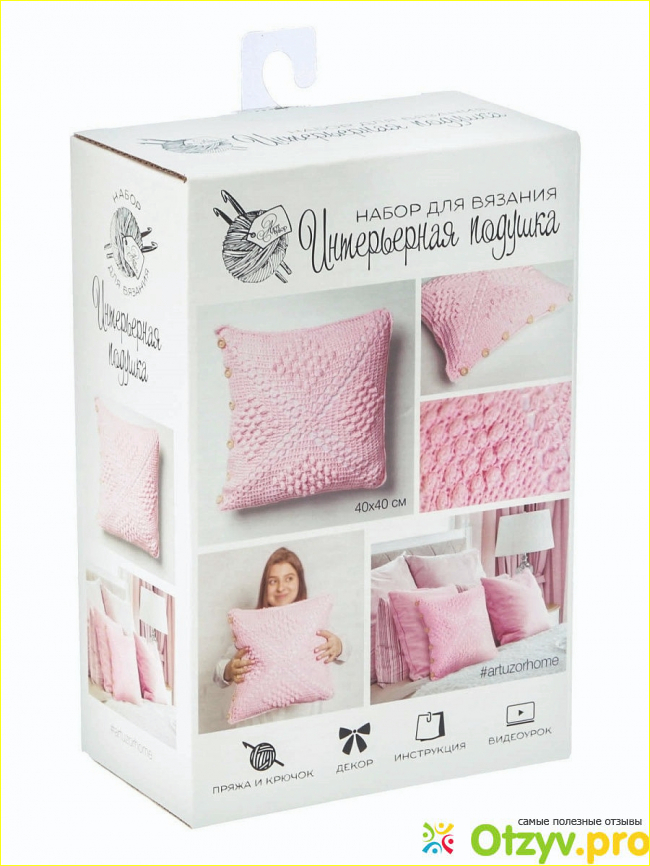 Недавно я приобрела набор для взяания интереьерной подушки от производителя Арт узор. Это розовая подушечка размером 40*40 см. Нить акриловая, также в комплектации есть крючок, игла и пуговицы для декорирования. Производитель заявляет о том, что нить гипоаллергенная, а это значит, что изделие подойдет для детской комнаты, в особенности для девочек. Я планировала использовать подушечку для светлого дивана. И конечно с большим предвкушением начинала знакомиться с работой.