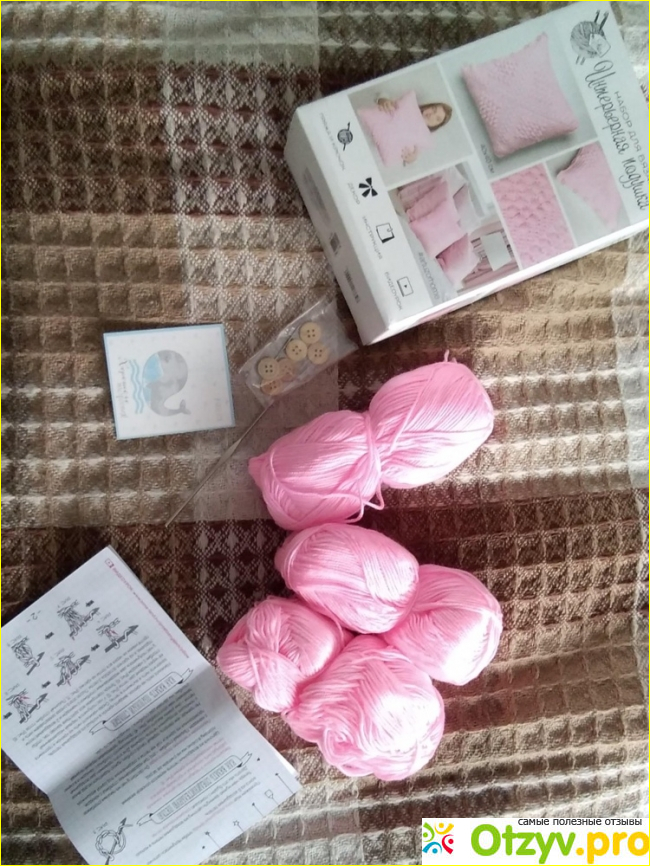 Я приобретала мой набор за 700 рублей по скидке. Первое, на что стоит обратить внимание, что в конечном счете у нас получится не подушка, а наволочка дял подушки. Заполнять ее нужно будет отдельно. Для этого понадобится наполнитель, или настоящая подушечка соответствующего размера. Нити довольно приятного, насыщенного розового оттенка, на ощупь мягкие и я думаю в процессе использования не будет катышек и других неприятностей.
