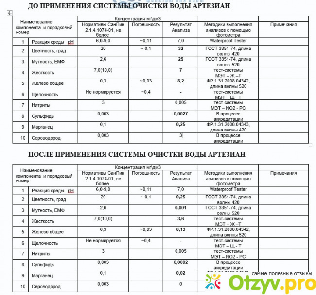 Вода по показателем воды у меня большие превышения по растворенному железа, марганцу, мутности, цветности. Прикрепляю анализ воды. Данный анализ мне сделала компания Артезиан. Стоимость анализа хорошая. Получилось 2000 рублей сделать доскональный анализ воды. Делался он в лаборатории на улица Касаткина дом 13.