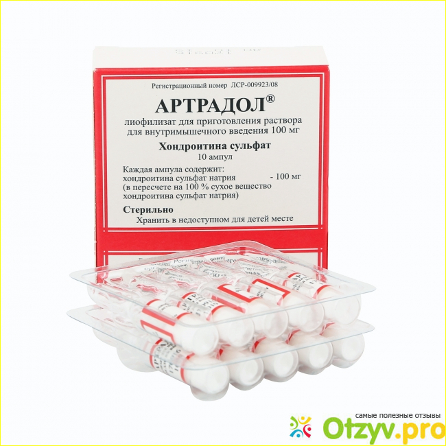 Следует отметить, что хондропротекторы различаются по своему составу и классу: 1- хондропротекторы выполненные из вытяжки продуктов животного происхождения;2- монокомпонентные средства, в составе которого содержится либо глюкозамин, либо хондроитин;3- комбинированные средства, когда в составе содержатся сразу же два компонента, что гарантирует наибольший результат и эффективность при лечении. Дополнительно к таким видам препаратов могут добавлять вспомогательные компоненты типа нестероидных веществ, витаминов и так далее. Артрадол относится к монокомпонентному средству, так как в составе только одно действующее вещество хондроитина сульфат в дозировке по 100 мг. Препарат выпускается в форме ампул с раствором для внутримышечного введения.