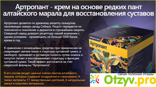 В первую очередь конечно же расскажем, что такое крем артропант. Артропант является мазью на основе натуральных компонентов не имеющий аналогов, в которых содержится аминогликаны пантов алтайского марала, а также экстракты целебных растений. Учитывая факты о том, что средство состоит только из натуральных компонентов, оно достигает невероятные воздействие на хрящевые ткани. Мазь просто действует на ткани, она работает регенерирующим образом, снимает воспаление и устраняет боль, защищает сосуды и устраняет все возможные инфекции.