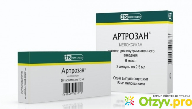 Выпускается препарат в форме таблеток, а также в форме инъекционного раствора. Главным компонентом, а именно действующим веществом выступает мелоксикам, а в качестве вспомогательных компонентов: глицин, гликофурфурол, раствор натрия гидроксида, натрия хлорид, меглюмин, полоксамер, вода для инъекций. Имеет в свою очередь Артрозан противовоспалительное, жаропонижающее, болеуталяющее действие, а относится к нестероидным противовоспалительным медикаментам. Самым главным показанием, при котором назначается препарат, выступают дегенеративные заболевания суставов, как острого, так и хронического характера.