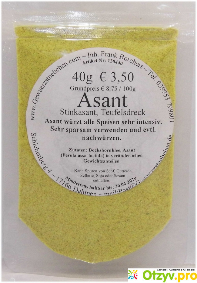 Смола асанта широко используется в качестве пряности в Афганистане, Пакистане, Иране и Индии, некоторых других странах, но особенно в индийской кухне. Побеги являются также частью вустерширского соуса. Препарат Асант, или смола от желтоватого до оранжево-коричневого цвета «Asa foetida» (переводится как грязь дьявола), содержит от 24 до 65% смолы, камеди и 6–16% эфирного масла, которое содержит, помимо прочего, азаресинотаннол, его эфир феруловой кислоты и ванилин.