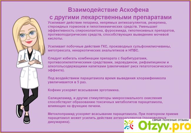 В молодости я периодически принимала именно Аскофен при различных видах боли, поскольку не было такого большого разнообразия лекарственных средств, как сейчас. Он достаточно быстро и надолго снимал болевой синдром, и мне никогда не приходилось употреблять максимальных доз. Еще меня вполне устраивало, что в его составе есть кофеин, поскольку в те годы у меня было низкое давление. Сейчас АД бывает повышенным, да и кое-какие болезни, при которых надо с осторожностью принимать данный препарат, появились. Тем не менее, недавно мне все-таки пришлось принять Аскофен при мигрени, ничего другого в дачной аптечке не оказалось. Одна таблетка сделала свое дело – минут через 20 головная боль поутихла. Побочки не было, и никакие болячки не обострились.
