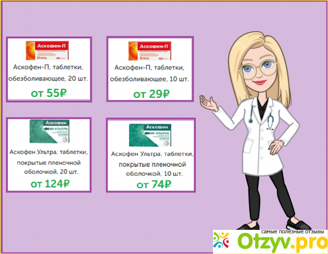 В настоящее время в аптеках можно встретить разновидности препарата – Аскофен-П и Аскофен Ультра, отличающиеся пропорцией входящих в их состав компонентов, и ценой. Так, в первом из вышеупомянутых содержится по 200 мг ацетилсалициловой кислоты и парацетамола и 40 мг безводного кофеина, а во втором – соответственно по 250 мг и 65 мг тех же активных веществ соответственно. Разумеется, стоимость таблеток с повышенным содержанием активных ингредиентов, выше.