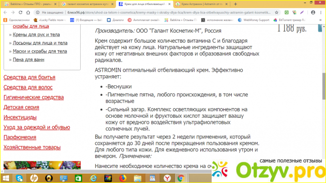Но чем старше она становилась, тем пятна были все выразительнее. Я начала понимать, что она стесняется этого. Я решила ей помочь. Посоветовалась со знакомым косметологом, она порекомендовала отбеливающие крема. И сказала, что самый лучший из них — это отбеливающий крем Astramin от Галант Косметик. Сомневаться в истину ее слов я не стала, поэтому сразу же зашла в магазин и купила крем. Итак, наши впечатления от данного продукта. Аромат крема приятный, химией на пахнет. Текстура однородная, нежная, белого цвета. Наносится легко. Мама втирала крем один раз в день (чаще всего утром на предварительно очищенную кожу лица). Через некоторое время мама заметила первые результаты. Большие пятна посветлели, а маленькие пятнышки и вовсе исчезли. Также мама обратила внимание, что темных кругов под глазами не стало. Кожа выглядит более ухоженной и помолодевшей. Astramin отлично увлажняет и питает, так что мама перестала пользоваться различными кремами, без которых раньше не могла провести и дня. Никаких аллергических реакций у мамы не возникло. Крем отлично ей подошел. Теперь моя мама выглядит очень красиво и молодо.