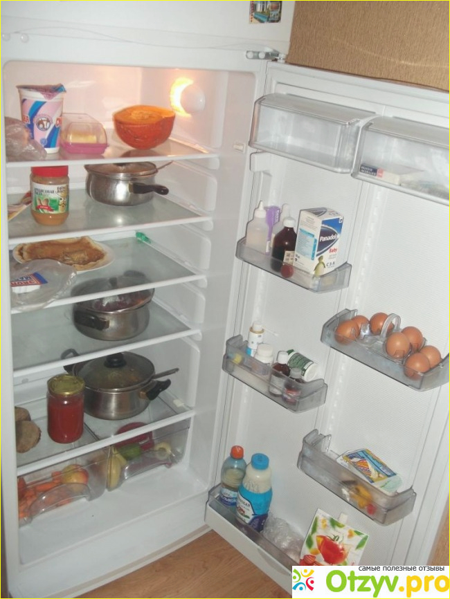 При открывание дверцы холодильника загорается свет и естественно при закрытие гаснет. Лампочка достаточно яркая и за восемь лет, не пришлось ее менять. В самом холодильники имеются пазы для полочек. Полки холодильника стеклянные, по бокам идет пластик. Достаточно тяжеловатые. Но очень прочные, мы хранили и стеклянные банки и железные. Кстати, данное стекло не царапается. В низу холодильника имеется два больших контейнера в них я обычно хранила овощи и фрукты, мне казалось это очень удобно. И минус это то, что нет звукового сигнала при не закрытой дверце холодильника