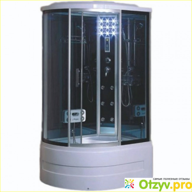 Причем дверцы сделаны из тонированного темно-синего стекла, а стенка - из стекла зеркального. Выглядит очень круто, поверьте. В данном гибробоксе есть много чего интересного. Например, дозаторы для шампуней. Это очень удобно, не надо наставлять кучу бутылочек на полку. В данном гидробоксе есть даже дисплей и возможность электронного управления!! В нем есть радио, которое отлично ловит все популярные радиостанции. Звук звучит отлично. И знаете, мыться под музыку, играющую в кабине, это очень круто. Панель в кабине очень красиво подсвечивается, что делает процесс мытья еще более романтичным!)А еще этот гидробокс даже способен принимать звонки с вашего стационарного телефона! Правда, я эту функцию так и не опробовала еще. Ну и конечно же, как не сказать, о глубоком и удобном поддоне. Глубина поддона-42 см, если что. В данном гидробоксе есть классический тропический душ, душевая лейка, гидромассаж ног (!!!) и вертикальный гидромассаж. Гидромассаж ног и вертикальный гидромассаж работает очень эффективно. И это просто нечто после тяжелого рабочего дня. Даже муж уже ни разу не пожалел, что согласился на мой вариант с гидробоксом. Так же в данном гидробоксе отлично работает встроенная вентиляция, так что он хорошо высыхает, в нем нет сырости и плесени. Лично мне кажется, что за 12000 гривен тяжело найти аналогичный вариант со столькими возможностями. И к тому же, он абсолютно герметичный. Не протекает, проверено!