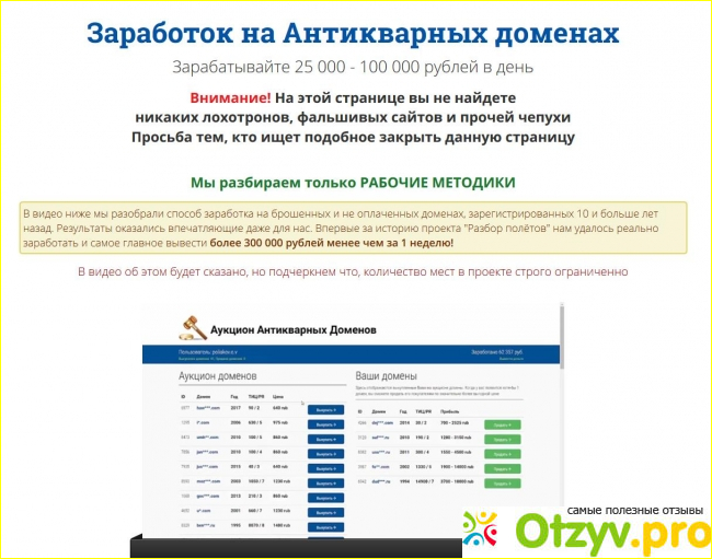 Аукцион антикварных доменов – это сайт на котором от имени проекта Разбор полетов рассказывается, как можно заработать на домене. И тут же предлагается у них купить парочку доменных имен и продать их дороже. Все как на аукционе.