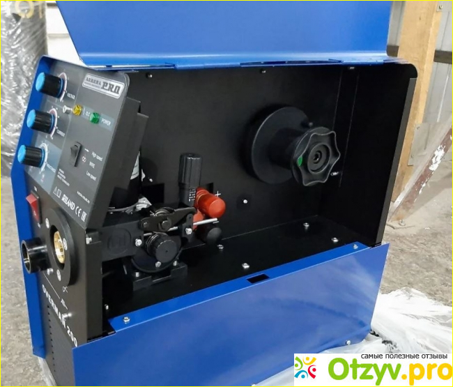 Относительные недостатки аппарата, а скорее всего их можно назвать придирками. Хотелось бы более длинный рукав горелки, хотя его можно докупить отдельно. Вес аппарата, заряженного проволокой почти 20 килограмм и размеры у него крупные. Всё это из-за того, что он довольно мощный и поэтому ему требуется хорошее охлаждение. Но ему просто необходима тележка и позаботьтесь об этом заранее! Лучше всего сразу приобретать баллон ёмкостью не меньше 10 литров и предусмотреть для него место в тележке. Чтобы установить килограммовую катушку с проволокой приходится немножко аппарат доработать. На это уходит немного времени и вся информация есть в интернете.