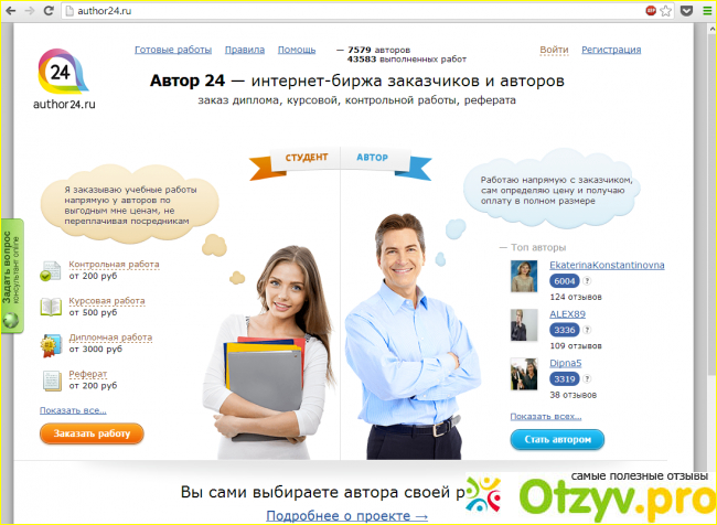 На сайте Author24.ru я несколько раз заказывала курсовые работы. Цену здесь приемлемые, я сравнивала расценки на других подобных ресурсах и мне показалось, что здесь они минимальные. Выбор исполнителей большой. И можно самостоятельно выбирать человека, который будет готовить проект.