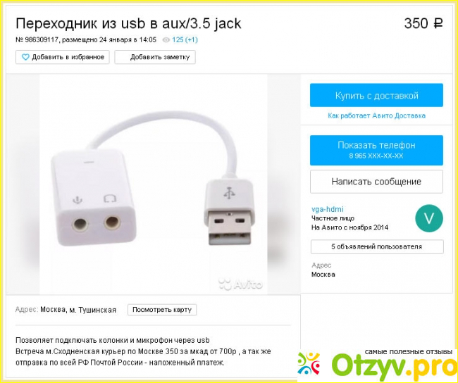 Продавец нам сразу подсказывает, что такой "шнурок" поможет подключить через USB-вход колонки или микрофон. Стоит не так и дорого - триста пятьдесят рубликов. А приобрести можно при встрече на станции метро Сходненская. Либо закажите доставку за пределы Московской Кольцевой автодороги, а при острой необходимости допускается даже почтовая пересылка по территории всей Российской Федерации через Почту России наложенным платежом.